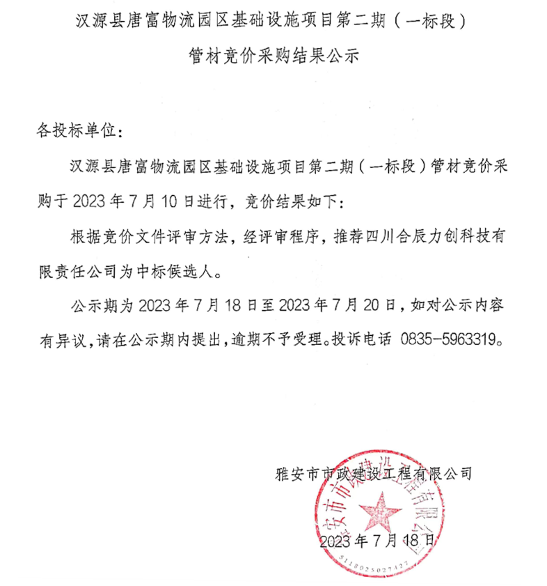 漢源縣唐富物流園區(qū)基礎(chǔ)設(shè)施項(xiàng)目二期(一標(biāo)段)管材競價(jià)采購結(jié)果公示