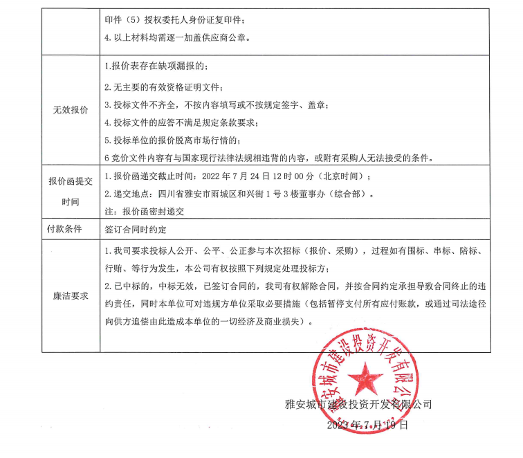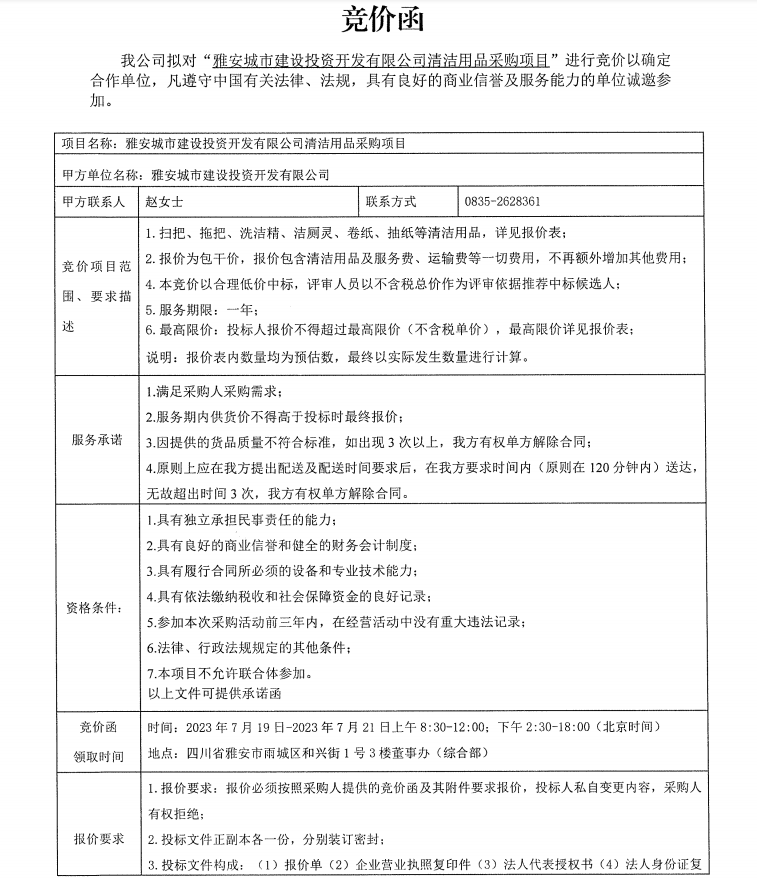 雅安城市建設(shè)投資開(kāi)發(fā)有限公司清潔用品采購(gòu)項(xiàng)目競(jìng)價(jià)公告