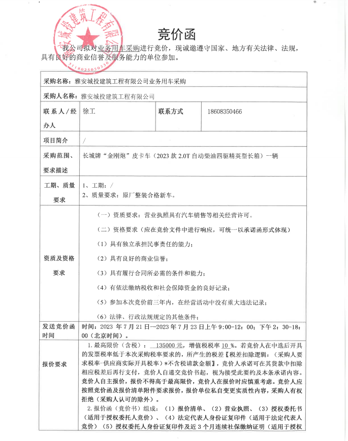 雅安城投建筑工程有限公司業(yè)務(wù)用車采購競價公告