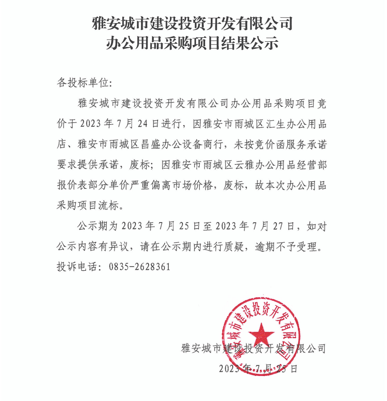 雅安城市建設(shè)投資開發(fā)有限公司辦公用品采購項目結(jié)果公示