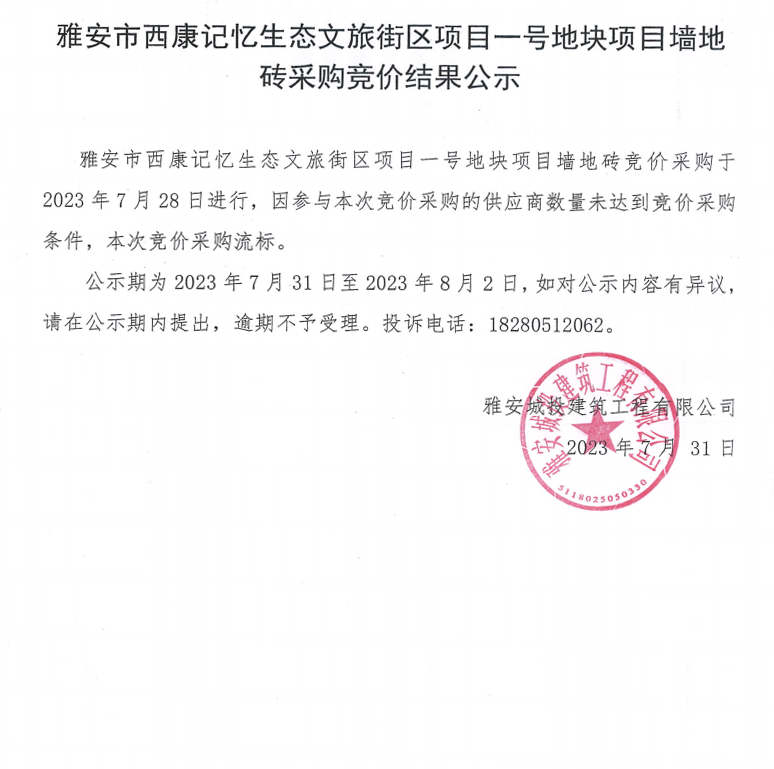 雅安市西康記憶生態(tài)文旅街區(qū)項目一號地塊項目墻地磚采購競價結(jié)果公示