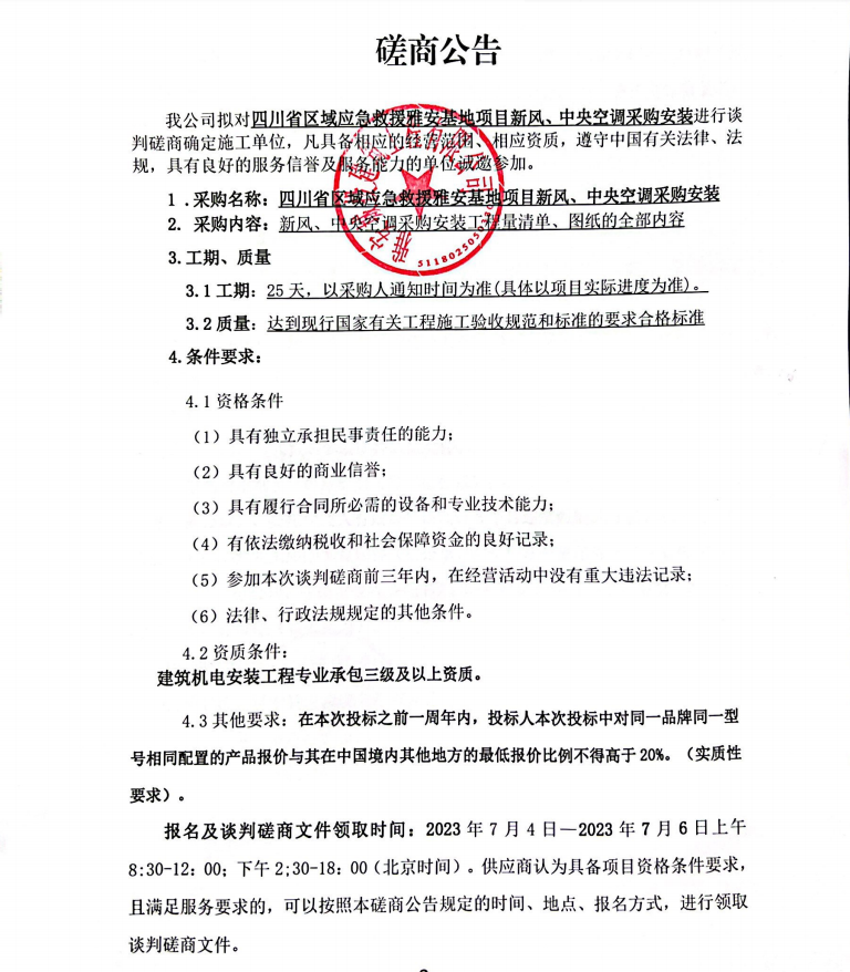 四川省區(qū)域應(yīng)急救援雅安基地項(xiàng)目新風(fēng)、中央空調(diào)采購安裝談判磋商公告