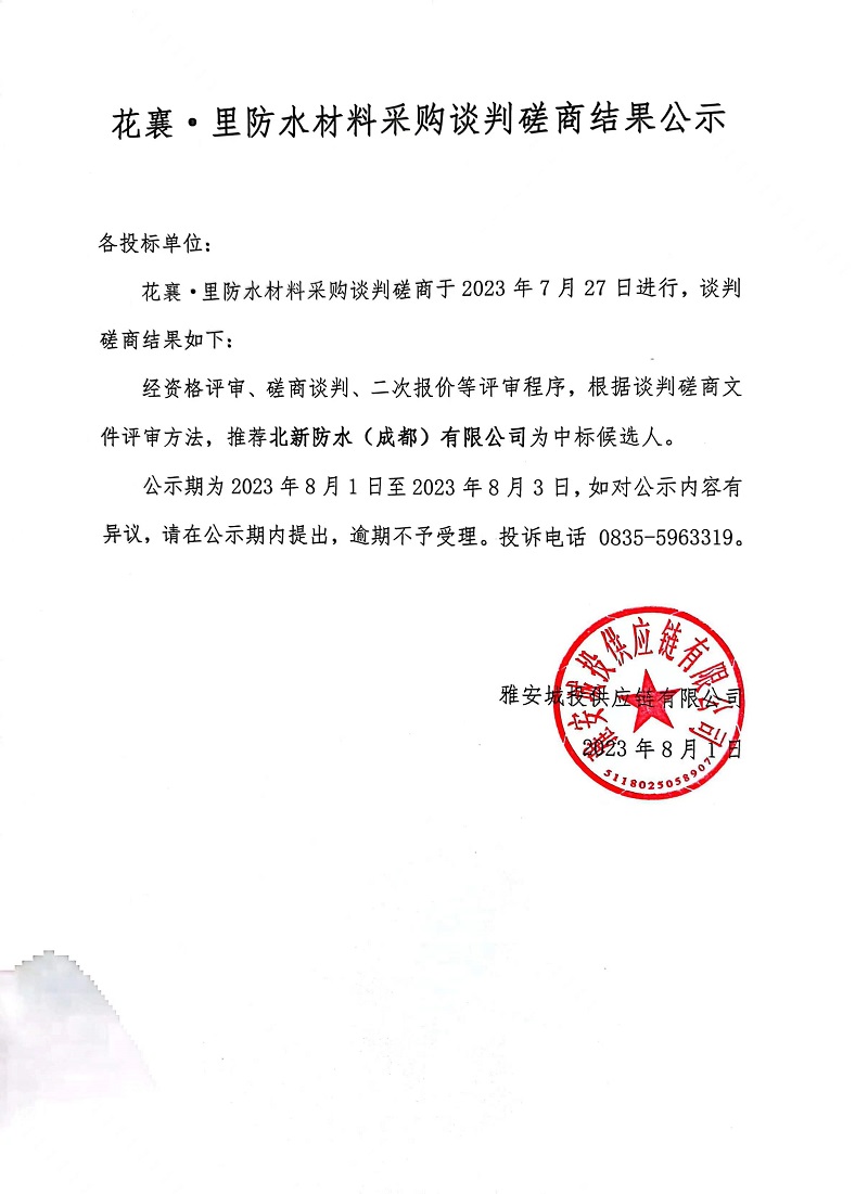 花襄·里防水材料采購談判磋商結果公示