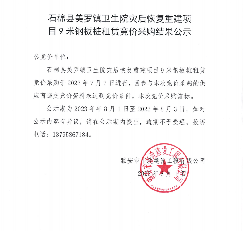 石棉縣美羅鎮(zhèn)衛(wèi)生院災(zāi)后恢復(fù)重建項目9米鋼板樁租賃競價采購結(jié)果公示