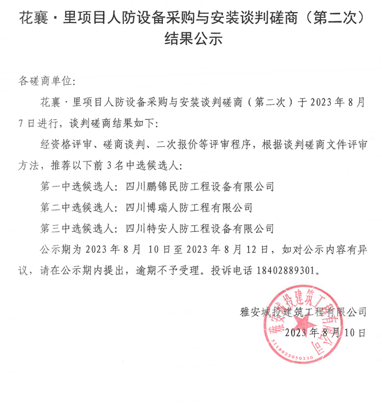 花襄·里項(xiàng)目人防設(shè)備采購與安裝談判磋商(第二次)結(jié)果公示