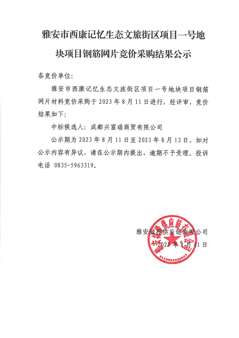雅安市西康記憶生態(tài)文旅街區(qū)項(xiàng)目一號地塊項(xiàng)目鋼筋網(wǎng)片競價(jià)采購結(jié)果公示