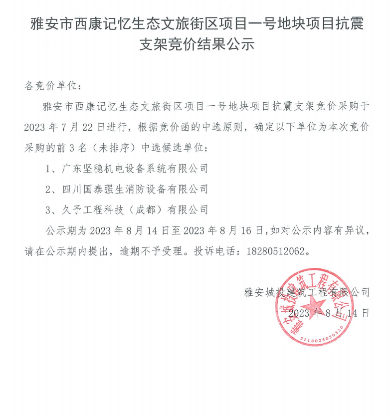 雅安市西康記憶生態(tài)文旅街區(qū)項(xiàng)目一號(hào)地塊項(xiàng)目抗震支架競價(jià)結(jié)果公示