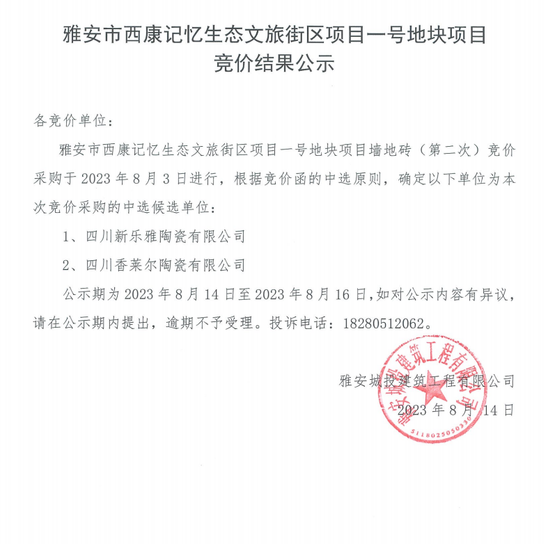 雅安市西康記憶生態(tài)文旅街區(qū)項(xiàng)目一號地塊項(xiàng)目墻地磚(第二次)競價(jià)結(jié)果公示