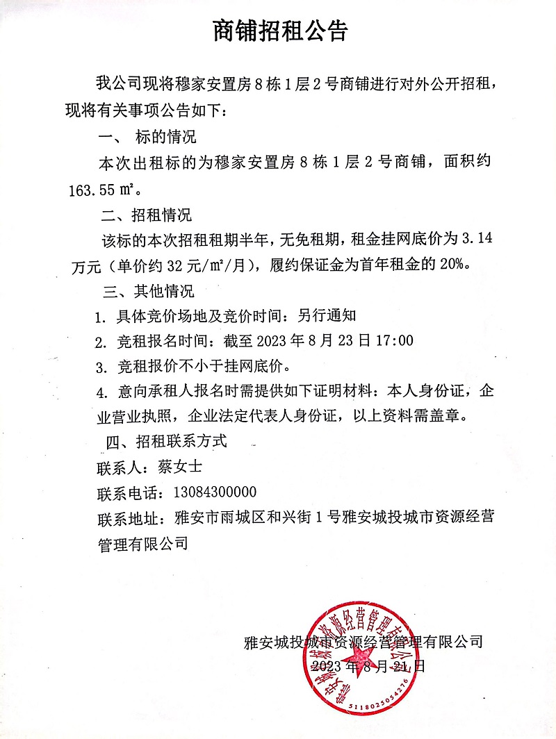 穆家安置房8棟1層2號(hào)商鋪招租公告