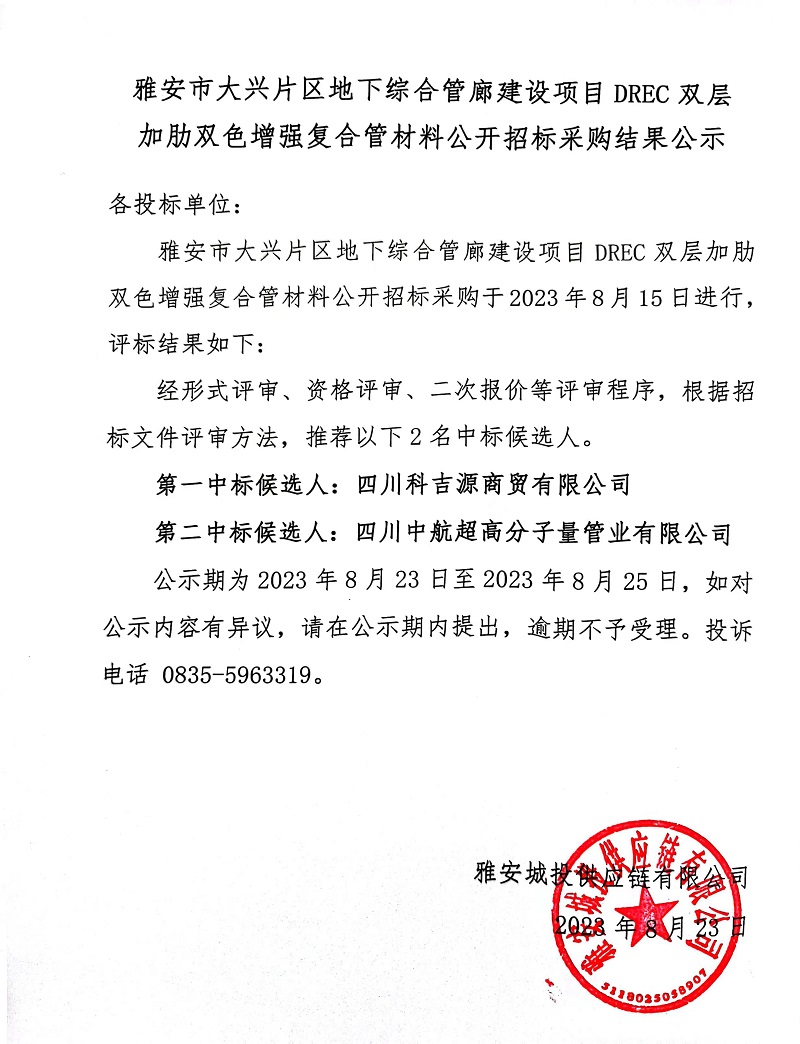 雅安市大興片區(qū)地下綜合管廊建設(shè)項(xiàng)目DREC雙層加肋雙色增強(qiáng)復(fù)合管材料公開招標(biāo)采購結(jié)果公示