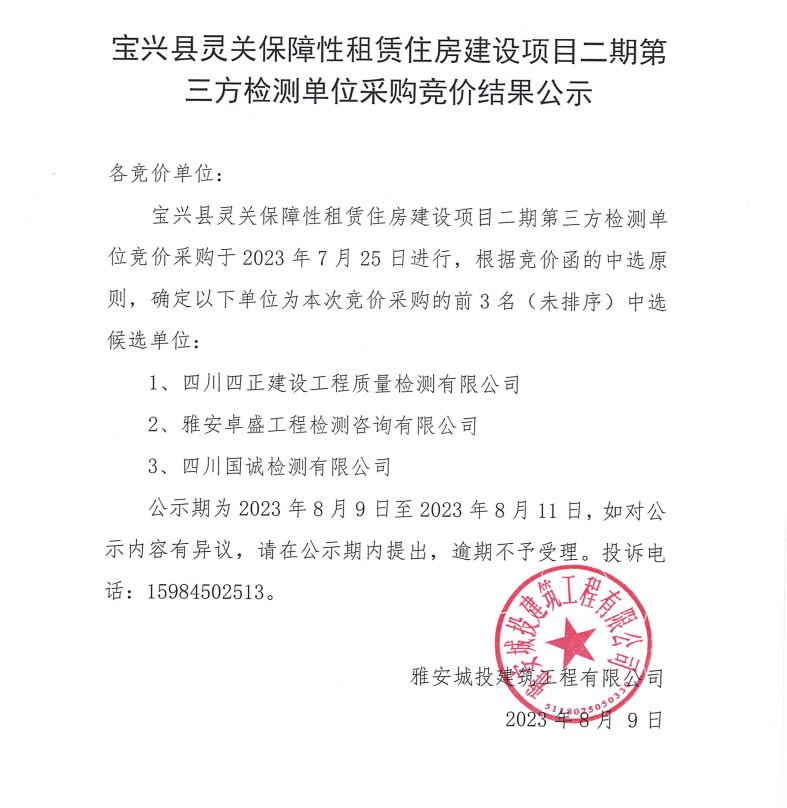 寶興縣靈關(guān)保障性租賃住房建設(shè)項(xiàng)目二期第三方檢測(cè)單位采購(gòu)競(jìng)價(jià)結(jié)果公示