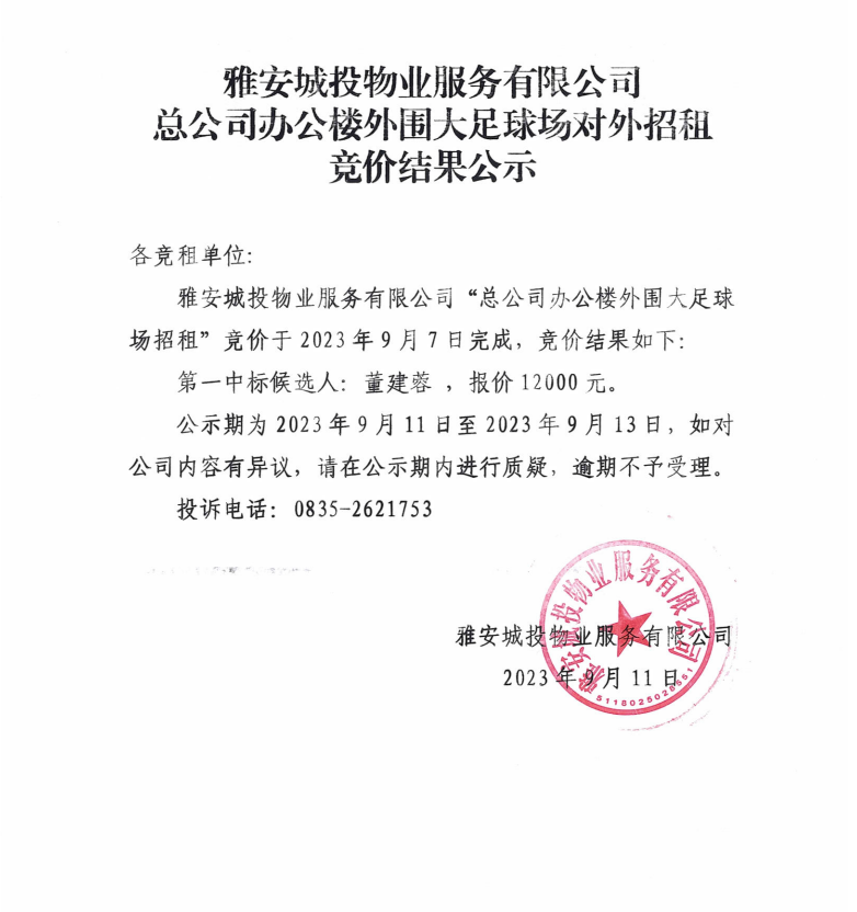 雅安城投物業(yè)服務(wù)有限公司總公司辦公樓外圍大足球場對(duì)外招租競價(jià)結(jié)果公示