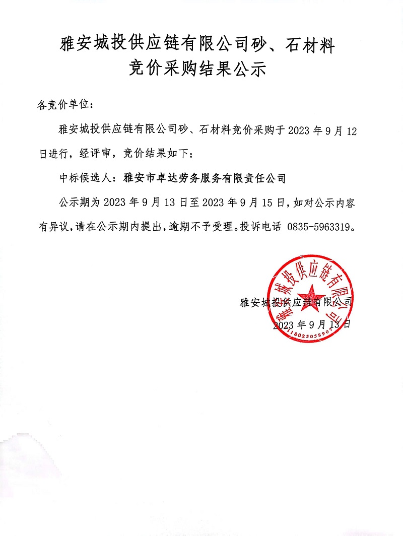 雅安城投供應(yīng)鏈有限公司砂、石材料競價(jià)采購結(jié)果公示
