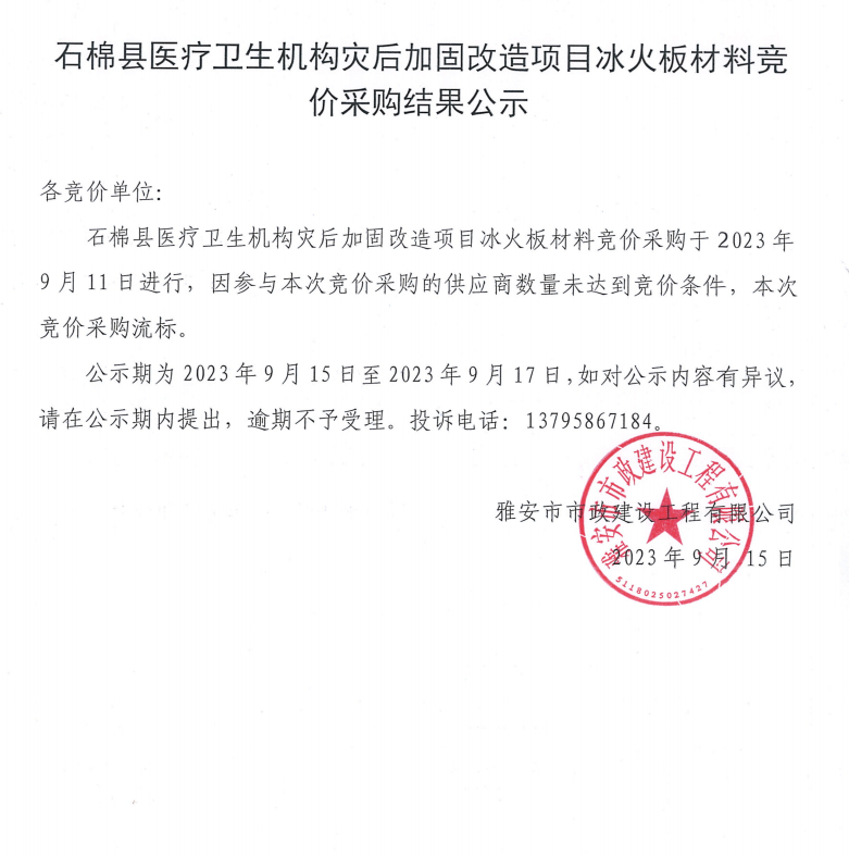 石棉縣醫(yī)療衛(wèi)生機(jī)構(gòu)災(zāi)后加固改造項(xiàng)目冰火板材料競價采購結(jié)果公示