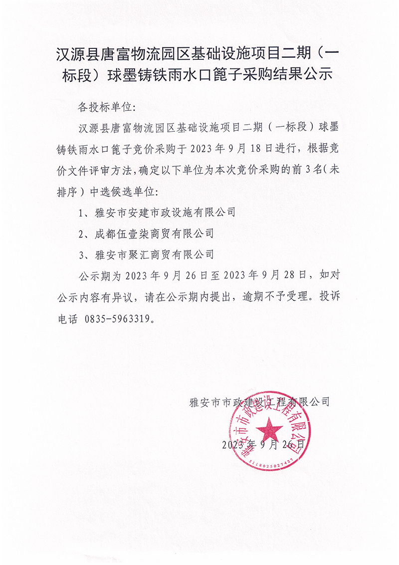 漢源縣唐富物流園區(qū)基礎(chǔ)設(shè)施項目二期(一標段)球墨鑄鐵雨水口篦子采購結(jié)果公示