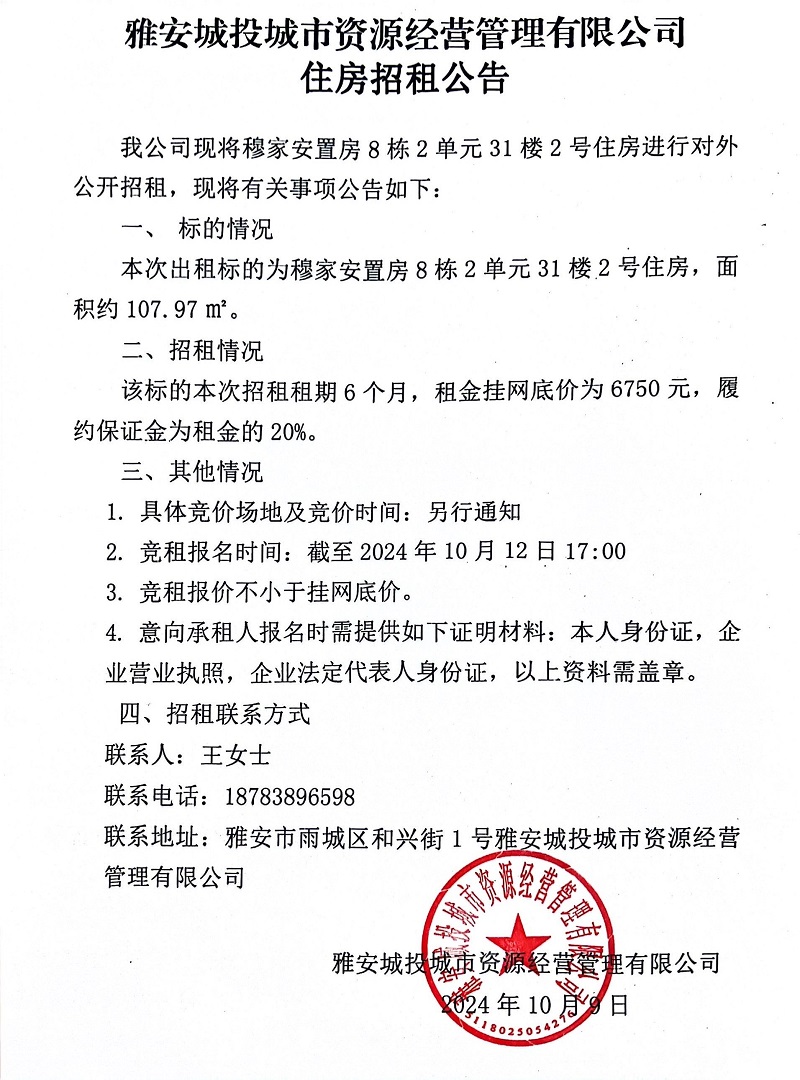 雅安城投城市資源經(jīng)營(yíng)管理有限公司關(guān)于穆家安置房8棟2單元31樓2號(hào)住房招租公告