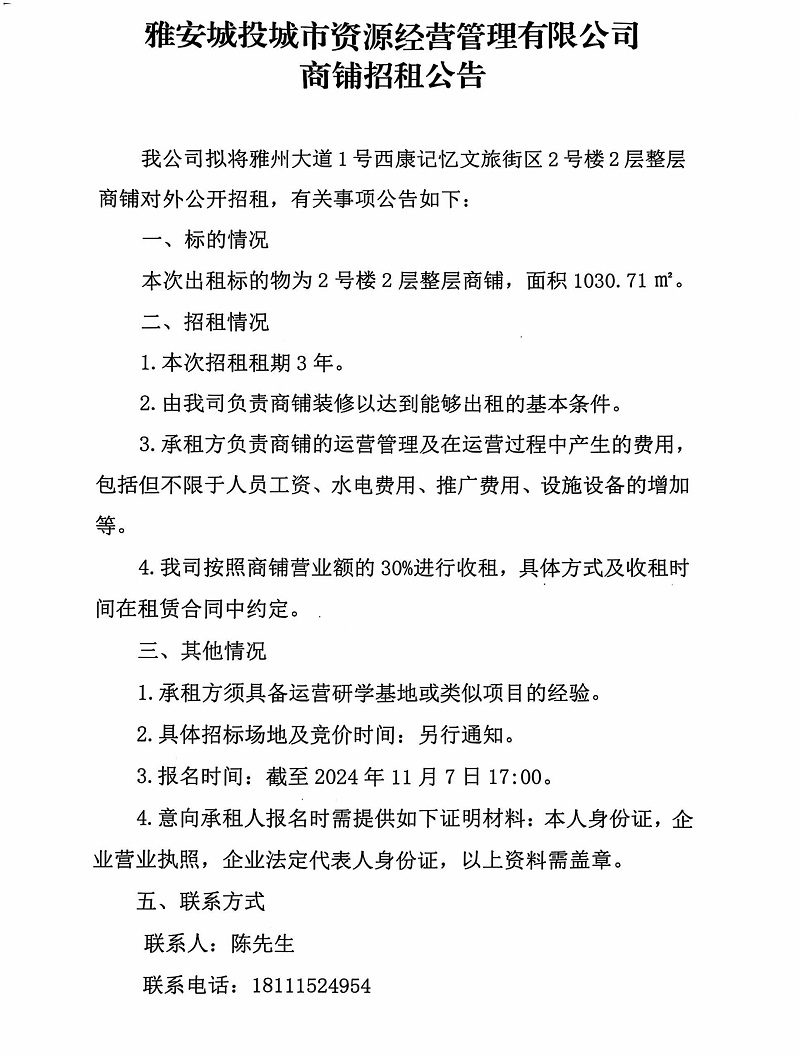 雅安城投城市資源經(jīng)營(yíng)管理有限公司雅州大道1號(hào)西康記憶文旅街區(qū)2號(hào)樓2層整層商鋪招租公告
