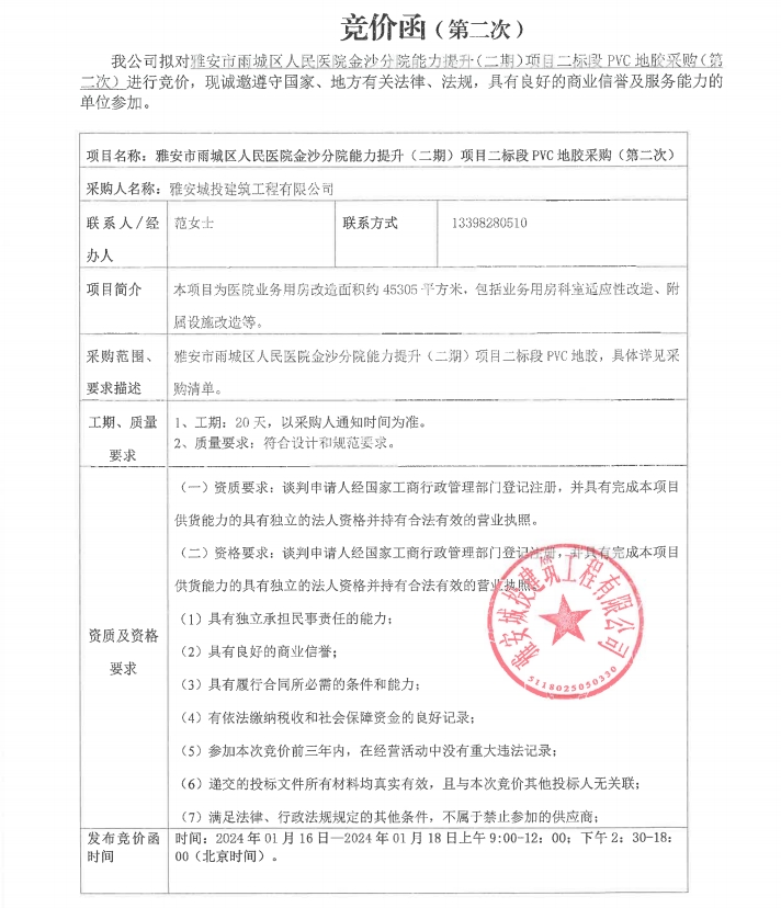 雅安市雨城區(qū)人民醫(yī)院金沙分院能力提升(二期)項(xiàng)目二標(biāo)段PVC地膠采購(第二次)競(jìng)價(jià)公告