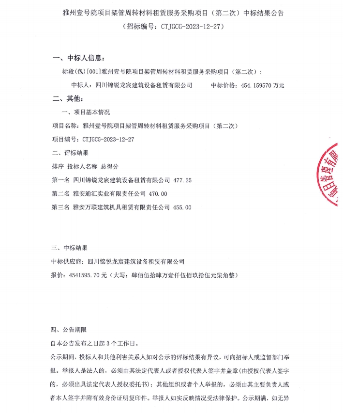 雅州壹號院項目架管周轉(zhuǎn)材料租賃服務(wù)采購項目(第二次)中標(biāo)結(jié)果公告
