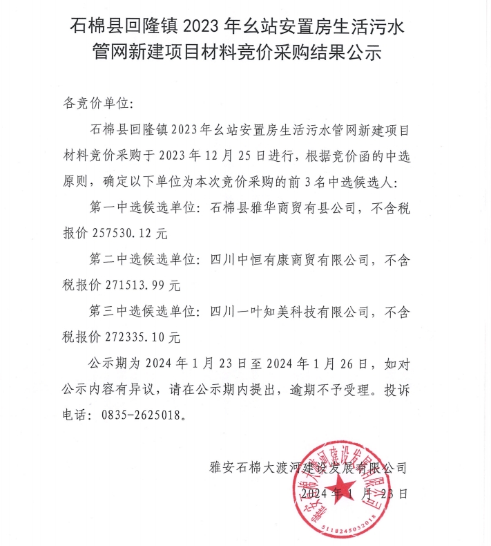 石棉縣回隆鎮(zhèn)2023年幺站安置房生活污水管網(wǎng)新建項(xiàng)目材料競價(jià)采購結(jié)果公示