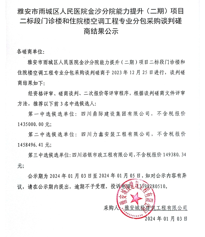 雅安市雨城區(qū)人民醫(yī)院金沙分院能力提升(二期)項目二標(biāo)段門診樓和住院樓空調(diào)工程專業(yè)分包采購談判磋商結(jié)果公示