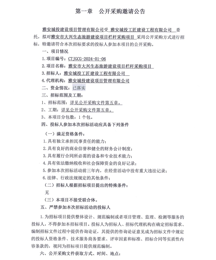 雅安市大興生態(tài)旅游建設(shè)項(xiàng)目欄桿采購(gòu)項(xiàng)目公開采購(gòu)邀請(qǐng)公告