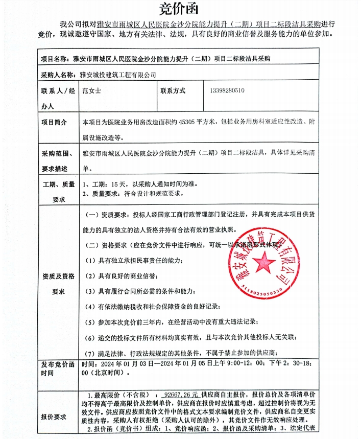 雅安市雨城區(qū)人民醫(yī)院金沙分院能力提升(二期)項目二標段潔具采購競價公告