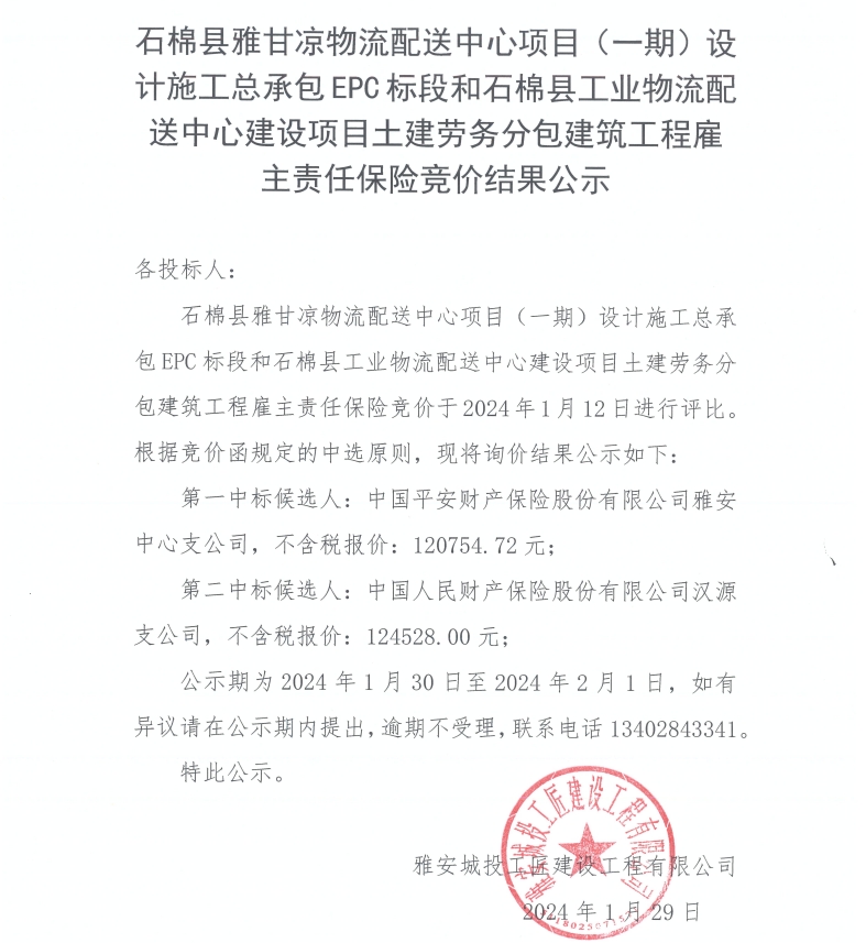 石棉縣雅甘涼物流配送中心項(xiàng)目(一期)設(shè)計(jì)施工總承包EPC標(biāo)段和石棉縣工業(yè)物流配送中心建設(shè)項(xiàng)目土建勞務(wù)分包建筑工程雇主責(zé)任保險(xiǎn)競(jìng)價(jià)結(jié)果公示