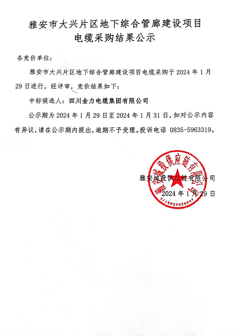 雅安市大興片區(qū)地下綜合管廊建設(shè)項目電纜采購結(jié)果公示