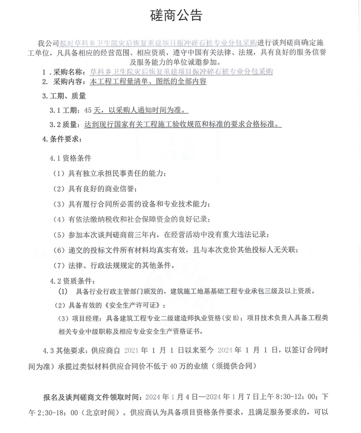 草科鄉(xiāng)衛(wèi)生院災(zāi)后恢復(fù)重建項(xiàng)目振沖碎石樁專業(yè)分包采購(gòu)談判磋商公告