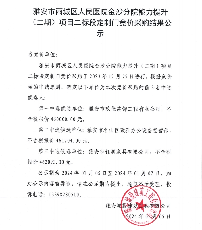 雅安市雨城區(qū)人民醫(yī)院金沙分院能力提升(二期)項(xiàng)目二標(biāo)段定制門競價(jià)采購結(jié)果公示