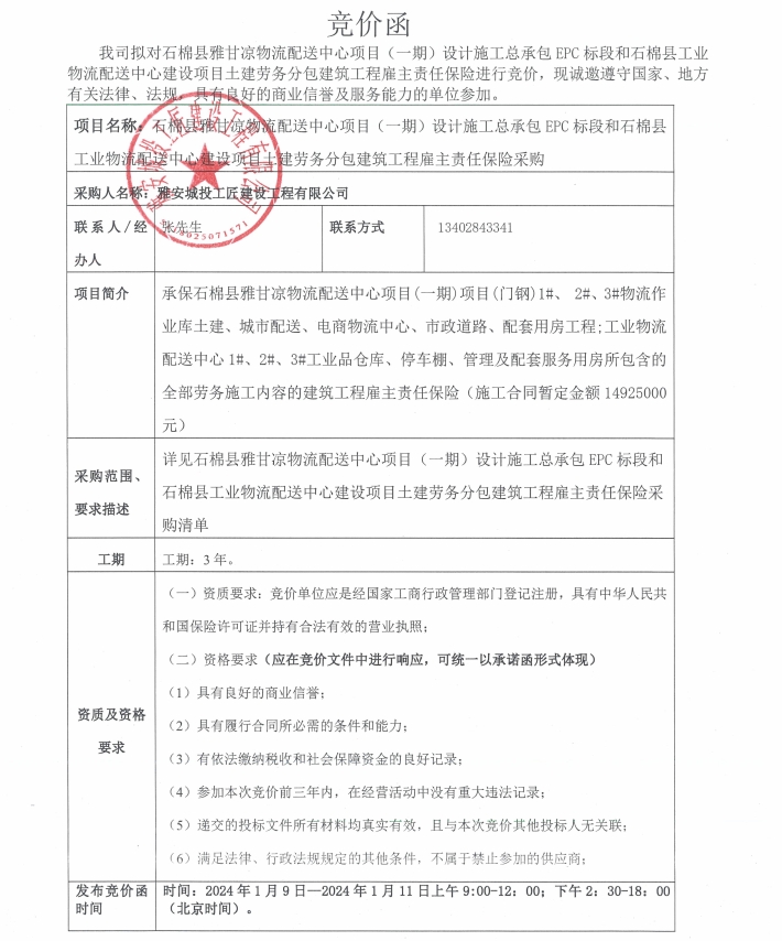 石棉縣雅甘涼物流配送中心項(xiàng)目(一期)設(shè)計(jì)施工總承包EPC標(biāo)段和石棉縣工業(yè)物流配送中心建設(shè)項(xiàng)目土建勞務(wù)分包建筑工程雇主責(zé)任保險(xiǎn)采購競價(jià)公告