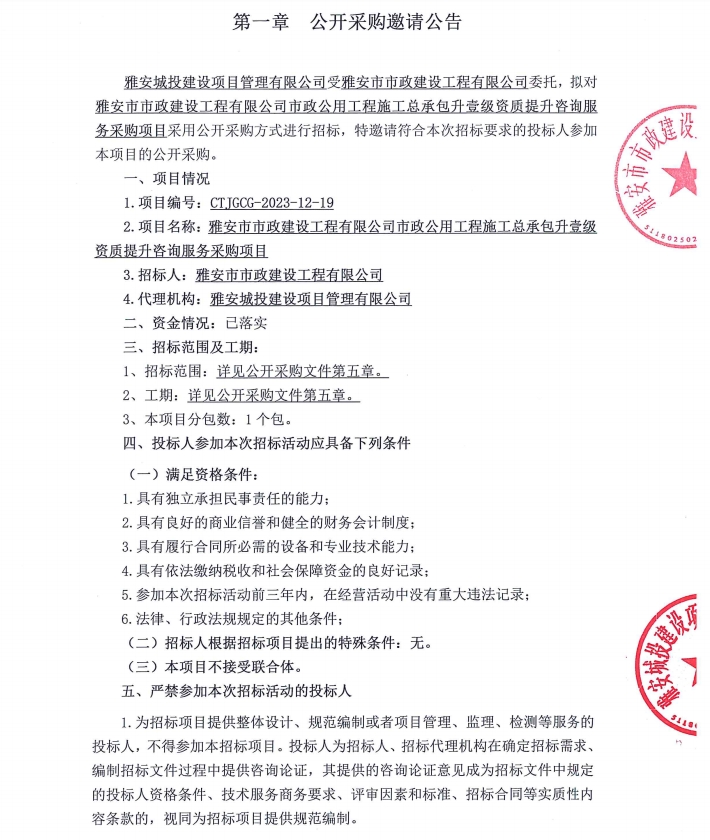雅安市市政建設(shè)工程有限公司市政公用工程施工總承包升壹級資質(zhì)提升咨詢服務(wù)采購項目公開采購邀請公告