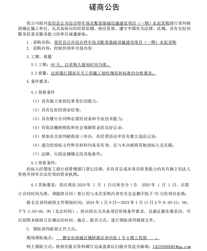 滎經(jīng)縣公共綜合停車場及配套基礎設施建設項目(一期)水泥材料采購談判磋商公告