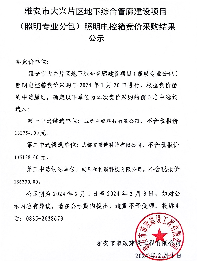 雅安市大興片區(qū)地下綜合管廊建設(shè)項(xiàng)目(照明專(zhuān)業(yè)分包)照明電控箱競(jìng)價(jià)采購(gòu)結(jié)果公示