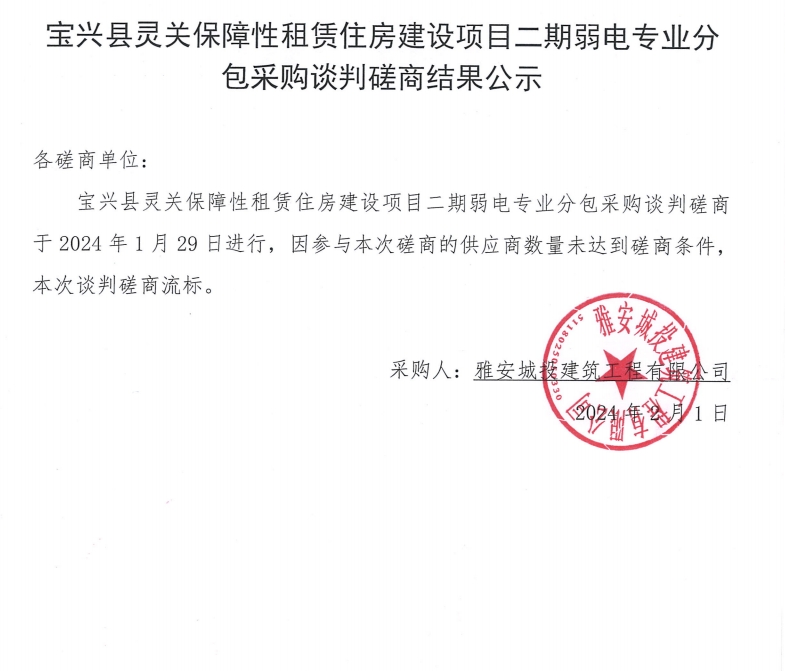 寶興縣靈關(guān)保障性租賃住房建設(shè)項(xiàng)目二期弱電專業(yè)分包采購(gòu)談判磋商結(jié)果公示