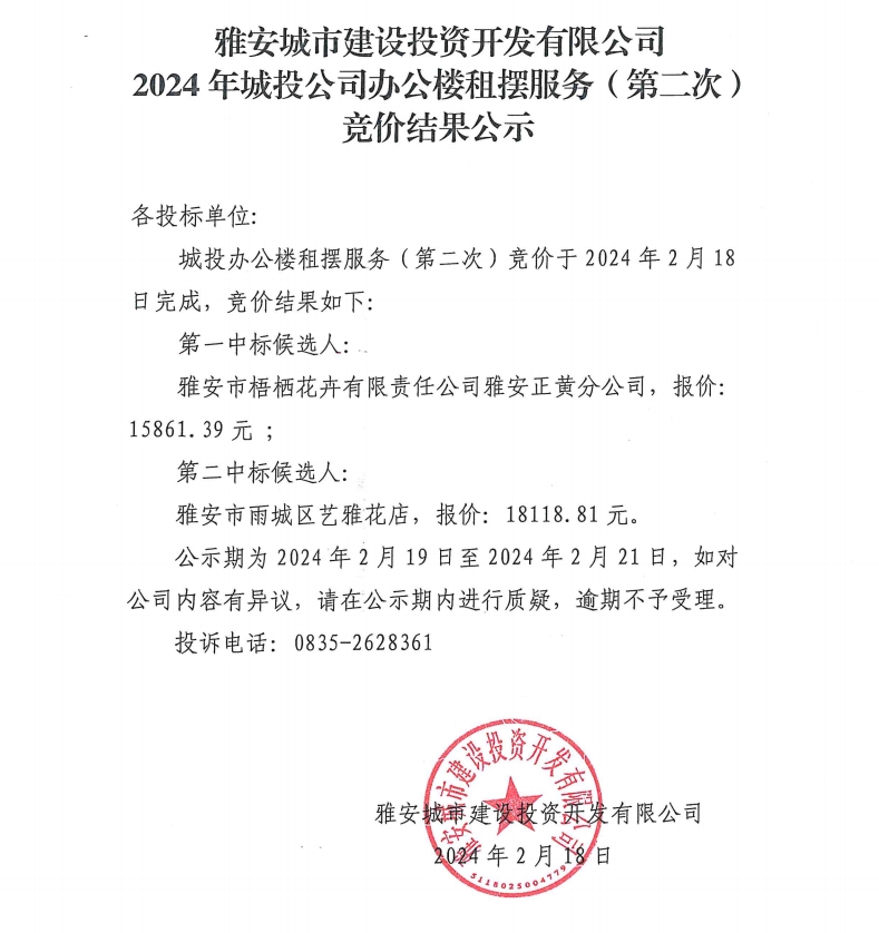 雅安城市建設(shè)投資開發(fā)有限公司2024年城投公司辦公樓租擺服務(wù)(第二次)競(jìng)價(jià)結(jié)果公示