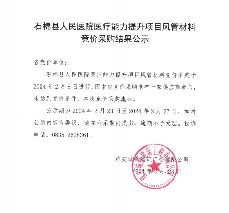 石棉縣人民醫(yī)院醫(yī)療能力提升項(xiàng)目風(fēng)管材料競(jìng)價(jià)采購(gòu)結(jié)果公示
