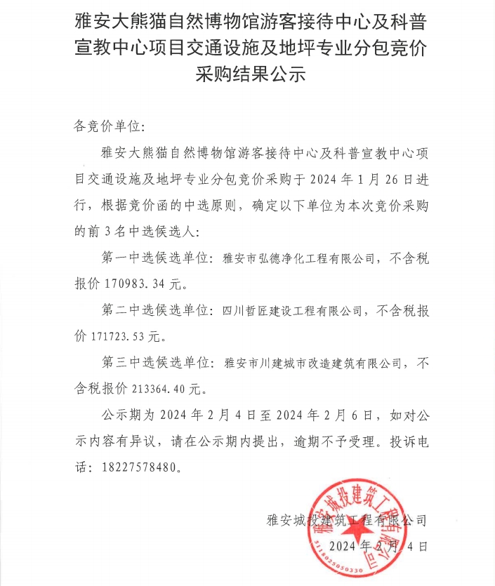 雅安市大熊貓自然博物館游客接待中心及科普宣教中心項(xiàng)目交通設(shè)施及地坪專(zhuān)業(yè)分包競(jìng)價(jià)采購(gòu)結(jié)果公示