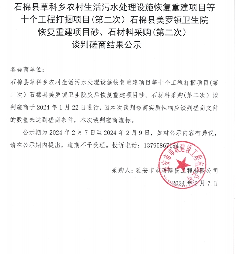 石棉縣草科鄉(xiāng)農(nóng)村生活污水處理設施恢復重建項目等十個工程打捆項目(第二次)石棉縣美羅鎮(zhèn)衛(wèi)生院恢復重建項目砂、石材料采購(第二次)談判磋商結果公示