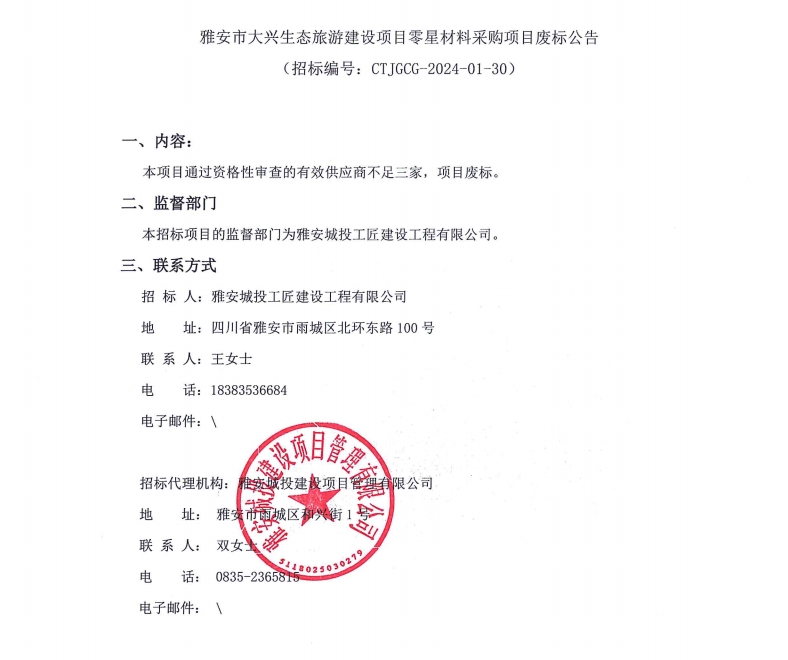 雅安市大興生態(tài)旅游建設(shè)項目零星材料采購項目廢標公告