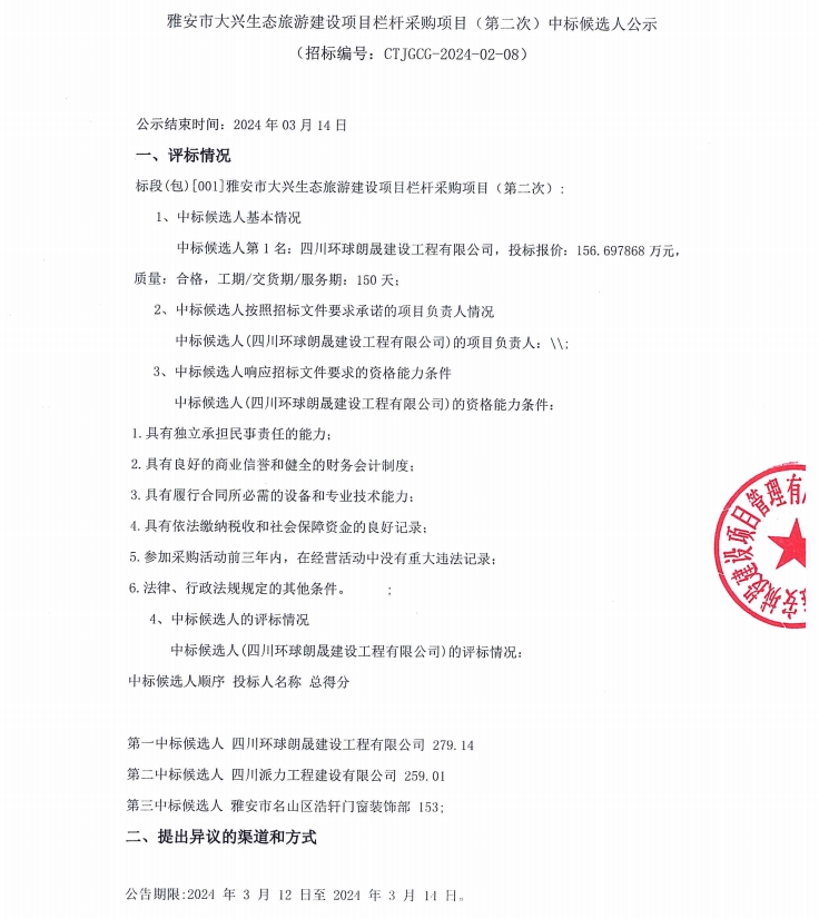 雅安市大興生態(tài)旅游建設(shè)項(xiàng)目欄桿采購(gòu)項(xiàng)目(第二次)中標(biāo)候選人公示