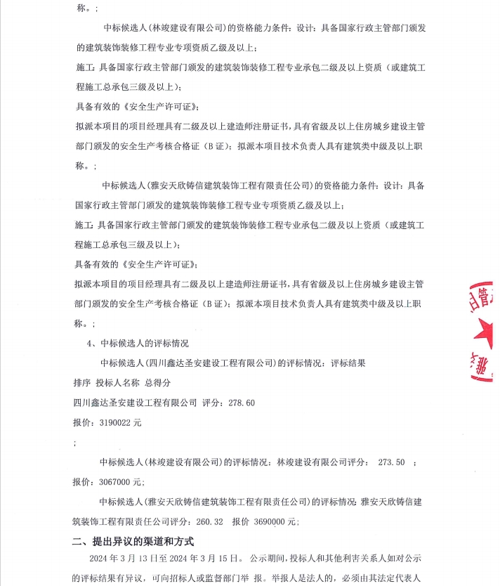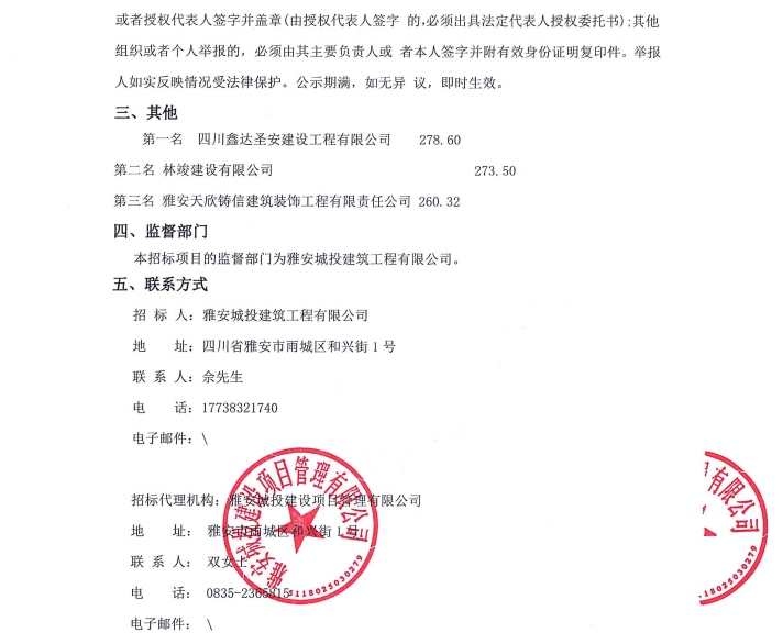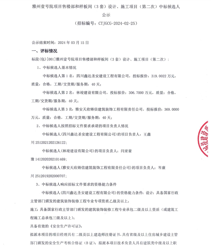 雅州壹號院項目售樓部和樣板間(3套)設計、施工項目(第二次)中標候選人公示