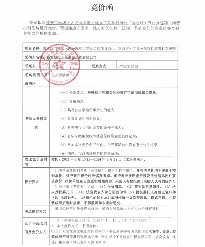 雅安市雨城區(qū)人民醫(yī)院能力建設二期項目綠化(含總坪)專業(yè)分包項目瀝青材料采購競價公告