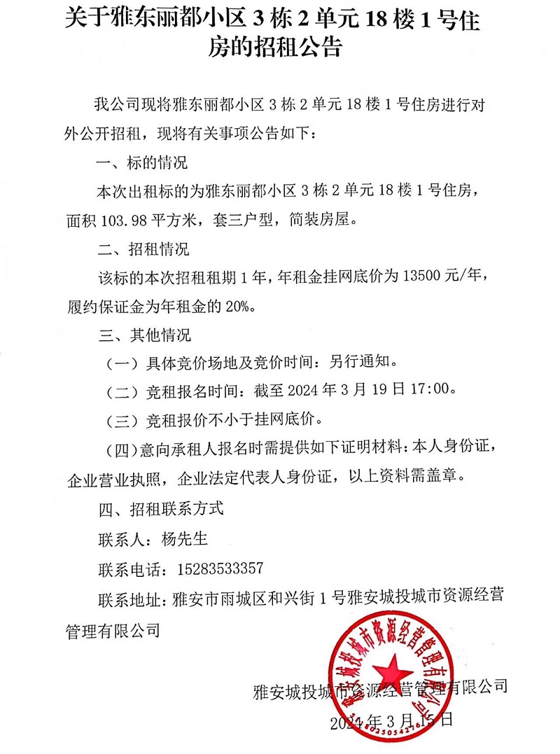 關(guān)于雅東麗都小區(qū)3棟2單元18樓1號(hào)住房的招租公告