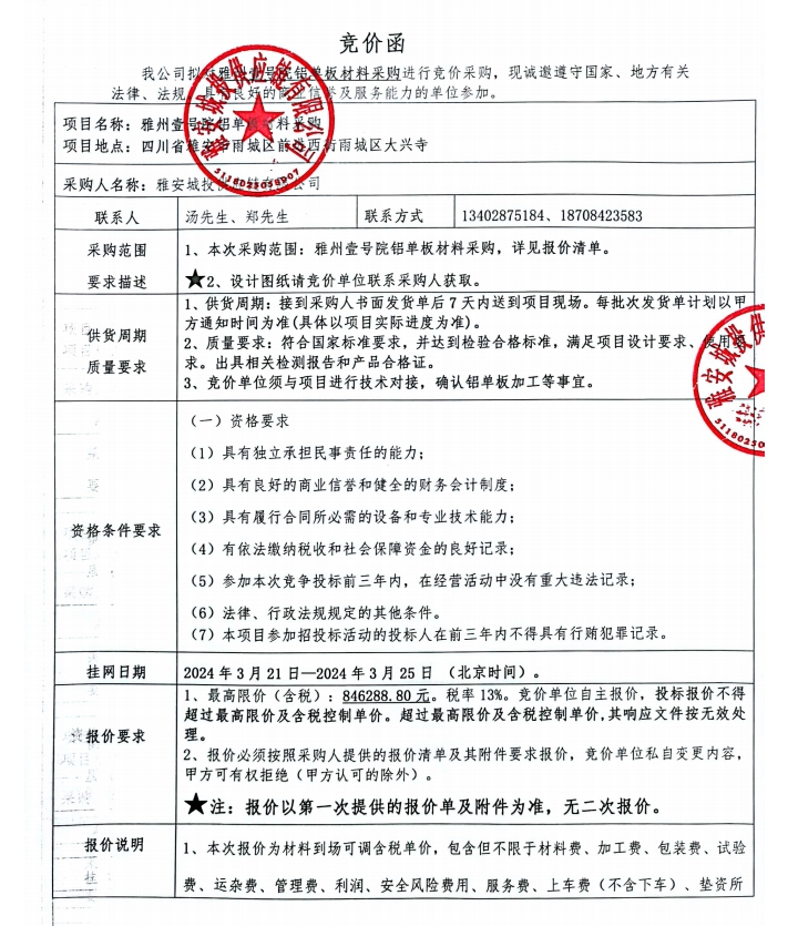 雅州壹號(hào)院鋁單板材料采購競價(jià)公告