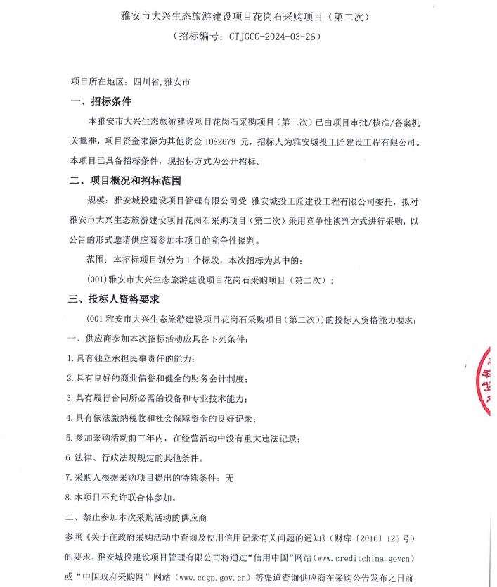 雅安市大興生態(tài)旅游建設(shè)項(xiàng)目花崗石采購項(xiàng)目(第二次)公告