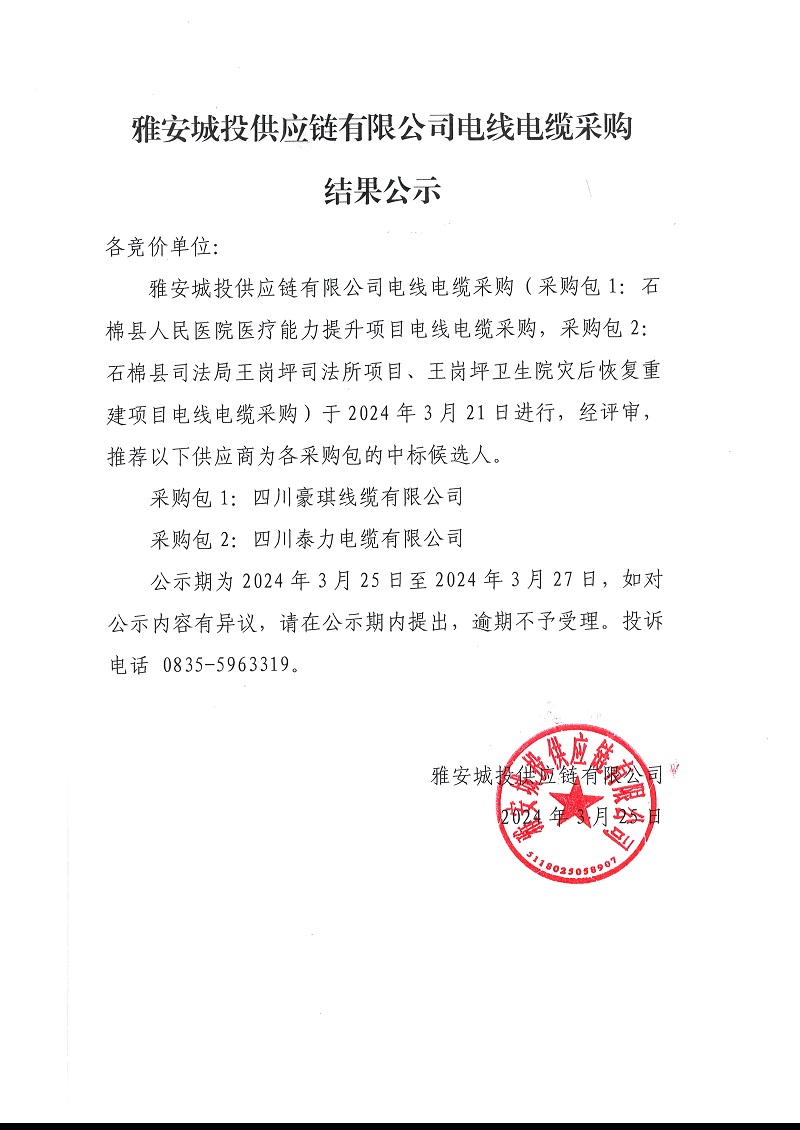 雅安城投供應鏈有限公司電線電纜采購結果公示