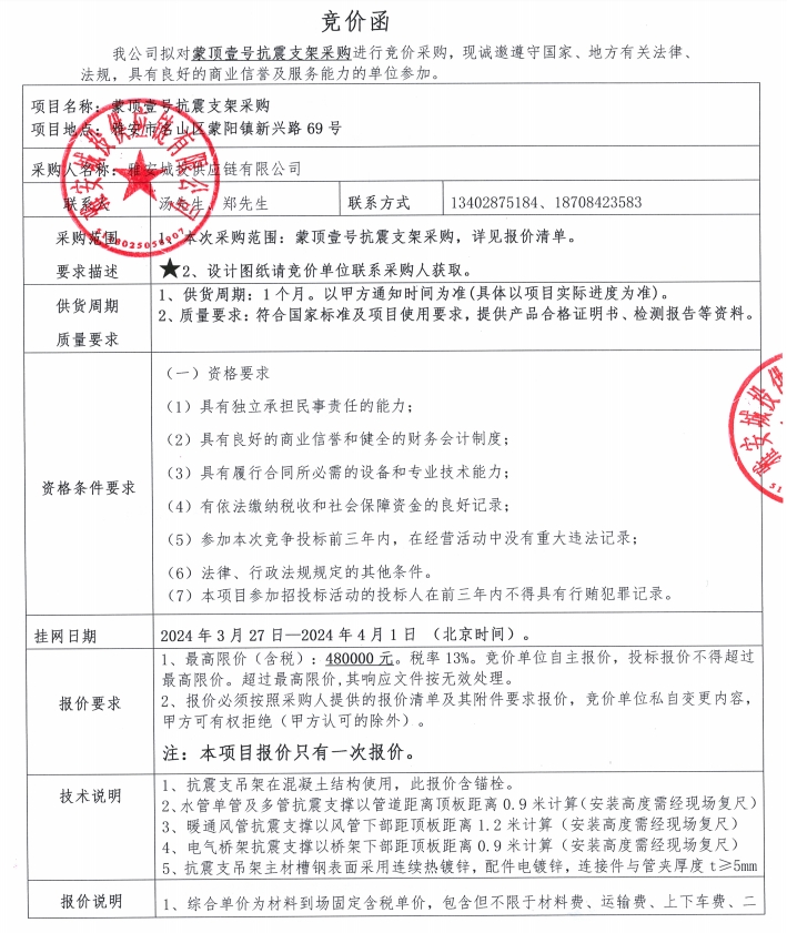 蒙頂壹號(hào)抗震支架采購(gòu)競(jìng)價(jià)公告