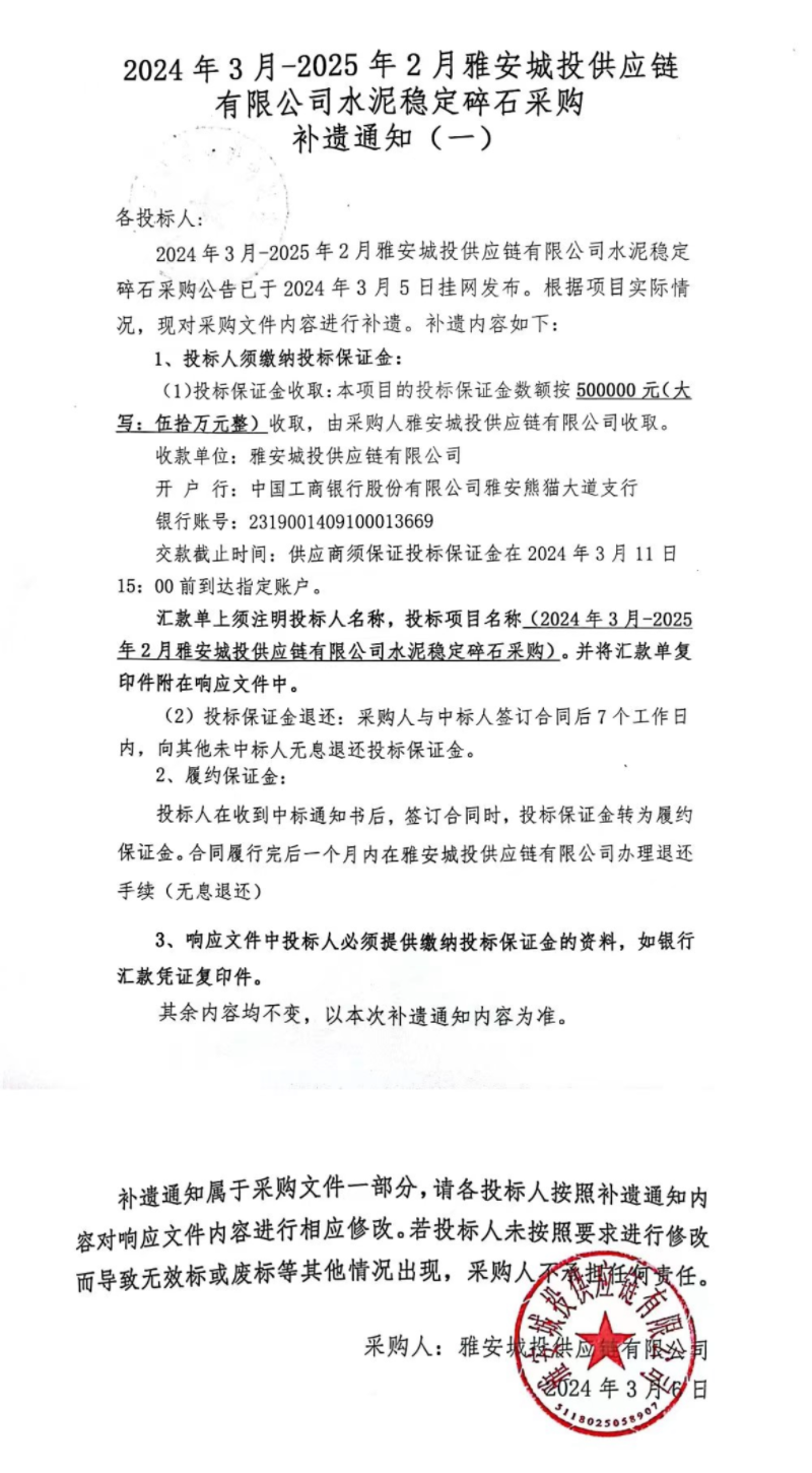 2024年3月-2025年2月雅安城投供應(yīng)鏈有限公司水泥穩(wěn)定碎石采購補(bǔ)遺通知(一)